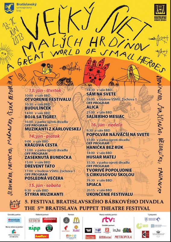 Srdečne Vás pozývame na 5. ročník Festivalu Bratislavského bábkového divadla, ktorý sa uskutoční od 13 do 16. júna 2013 pod názvom Veľký svet malých hrdinov