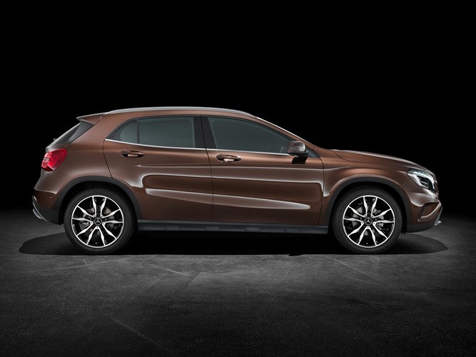 GLA stelesňuje silu a suverenitu aj pri pohľade zboku. Bočná štruktúrna línia dropping-line vedie v duchu filozofie od svetlometu až po podbeh zadnej nápravy. Línia ozdobnej lišty na spodnej hrane bočných okien stúpa od zadných dverí po zadný stĺpik. Spolu so svetelnou hranou na klenutí v pozdĺžnom smere a na protilínii vystupujúcej z výšky prahov smerom k bočnej štruktúrnej línii vzniká na boku osobitná hra línií, ktorá vdychuje vozidlu hravú dynamiku a subtílne napätie. Cladding na boku kopíruje obrysy podbehu a bočných prahov a prechádza až do zadného nárazníka. Na zdôraznenie charakteru SUV má prah priehlbiny na spôsob zubov lyžice bagra. Vrch vozidla dokončujú sériové strešné ozdobné lišty, ako osobitná výbava je k dispozícii hliníkový pozdĺžny držiak na strešný nosič v lesklej čiernej farbe alebo s lešteným povrchom. Na želanie jazdí GLA na diskoch s veľkosťou až 19 palcov.