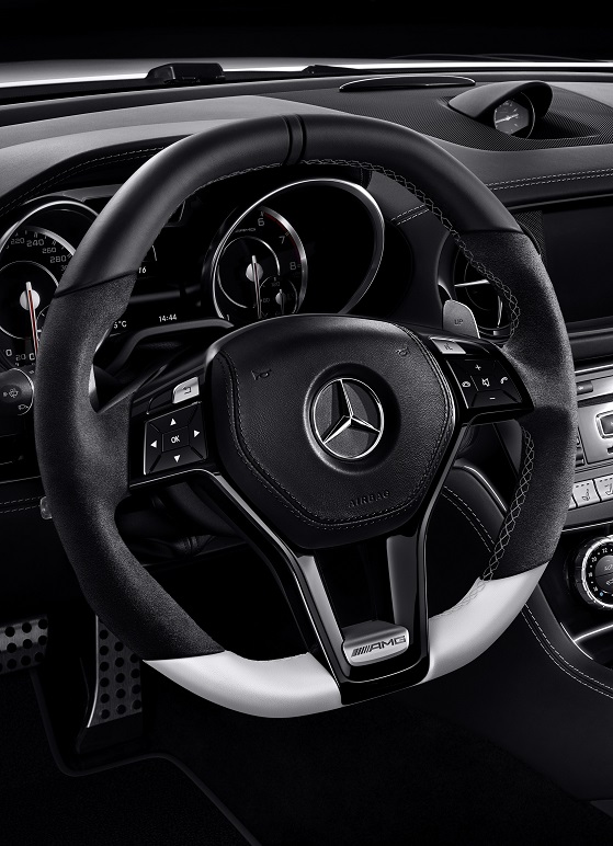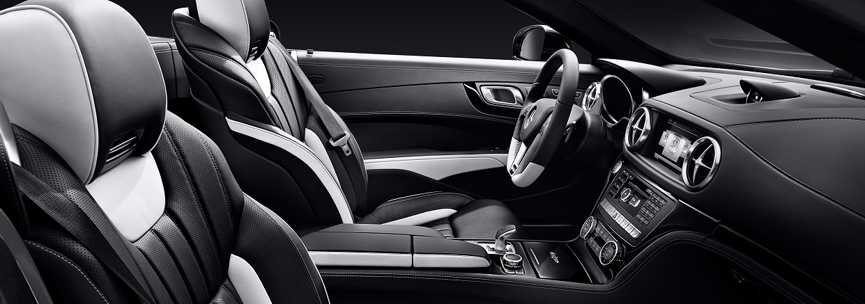 Vzájomná hra svetlých a tmavých odtieňov pokračuje v interiéri. Výrazné sedadlá so športovým dizajnom s pozdĺžnym prešívaním v čiernej koži napa kontrastujú s prvkami v koži designo napa platinová biela pearl. Bočné časti lakťových opierok dverí a stredovej lakťovej opierky sú tiež vyhotovené vo farbe designo platinová biela pearl. Koncepciu dvoch farieb možno nájsť aj na koženom volante designo a rohožiach AMG s nápisom AMG a objímkou v designo platinová biela pearl. Ozdobné prvky designo v čiernom klavírovom laku podčiarkujú exkluzívny vzhľad špeciálneho modelu. Vynikajúci komfort roadstera zabezpečujú sériovo balík aktívneho viackrivkového sedadla, klimatizácia sedadiel a systém vyhrievania priestoru okolo hlavy AIRSCARF pre vodiča a spolujazdca, ktoré z jazdy s otvorenou strechou spravia zážitok aj pri nižšej vonkajšej teplote.
