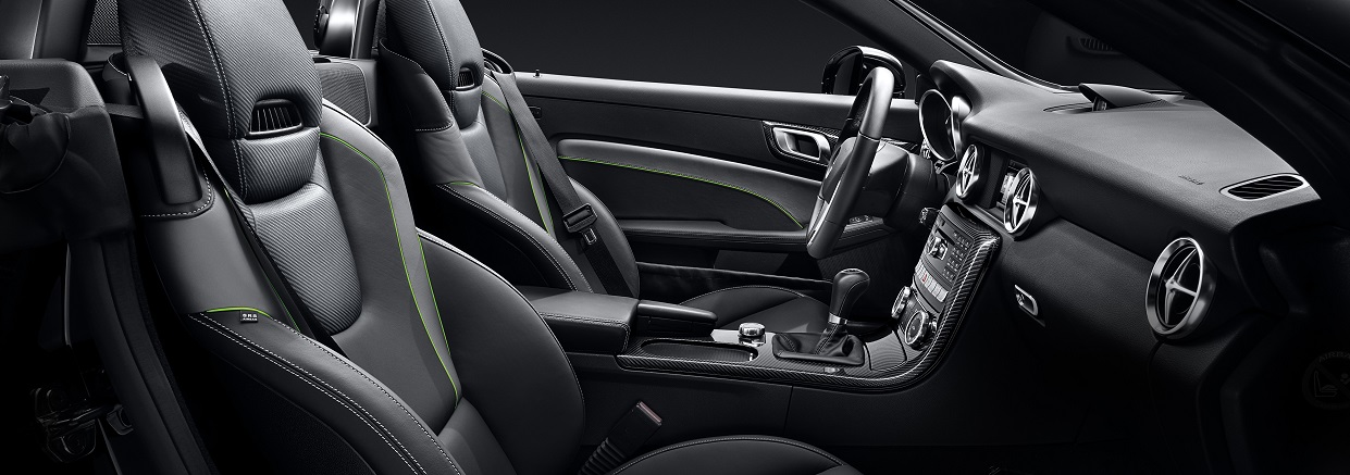 Interiér SLK CarbonLOOK Edition interpretuje moderný športový charakter s výraznými štýlovými prvkami. Dvojfarebné čalúnenie v koži napa čierna a designo titánová sivá pearl s nápadnými lemami v limetkovej zelenej na športových sedadlách a v stredových výplniach dverí zvyšujú dynamický vzhľad interiéru. Prispievajú k tomu aj karbónom ozdobené opierky hlavy. Ozdobné prvky AMG z kvalitného pravého karbónu a velúrové rohože s objímkou v limetkovej zelenej a logo edície zvyšujú športový prejav. Radiaca a voliaca páka sú potiahnuté kožou napa, z tohto materiálu je vyhotovená aj manžeta radiacej páky. Športový charakter špeciálneho modelu zdôrazňuje aj združený prístroj so vzhľadom cieľovej zástavy a radiace páky na volante v prípade vozidiel s automatom. Mimoriadny komfort zabezpečuje sériové vyhrievanie sedadiel, ako aj systém vyhrievania priestoru okolo hlavy AIRSCARF pre vodiča a spolujazdca.