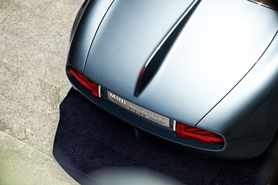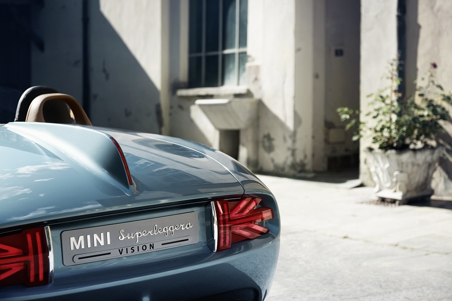 Závan extravagancie predstavuje výrazné krídlo na zadnej časti vozidla. Štúdii MINI Superleggera™ Vision dodáva jedinečnú dynamiku v priamom smere a zároveň zosobňuje nevšedné spojenie značiek MINI a Touring Superleggera. Je vytvarovaná s rovnakou vášňou pre detail ako „Touring-Linie“ bočnej siluety. Absolútnym magnetom plochej širokej zadnej línie sú nezvyčajné zadné svetlá: majú tvar britskej vlajky Union Jack a nevídaným spôsobom spájajú symboliku s funkčnosťou. Zdôrazňujú britský pôvod štúdie MINI Superleggera™ Vision a zároveň zvýrazňujú modernú LED-Techniku, ktorú využíva nové MINI. Zadné svetlá ohraničuje pás chrómu a tak z nich tvorí ikonu klasického britského klenotníctva. Zadnú časť tlačí k ceste karbónový výfuk.