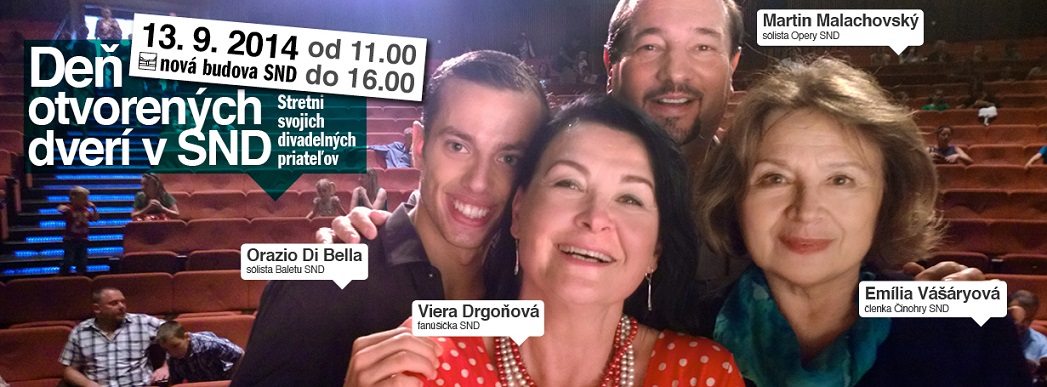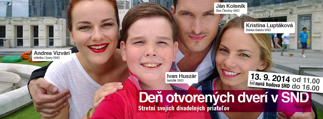 „Pozývaciu“ kampaň na Deň otvorených dverí v SND , ktorý sa uskutoční 13. 9. 2014 od 11.00 do 16.00 h, vytvorilo Centrum marketingu Slovenského národného divadla kompletne v interných kapacitách. Fotografovanie prebiehalo v druhej polovici júna, následne počas júla sa kreovala finálna podoba vizuálov, ktoré sú počas 5 týždňov umiestnené na citylightoch, internetových portáloch a v printových tituloch.