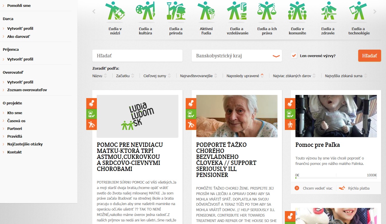 „Portál ĽudiaĽuďom.sk je oddnes prehľadnejší a modernejší, no najmä umožňuje používateľom omnoho ľahšiu orientáciu. Darca sa môže priamo na webe rozhodnúť, či pošle jednorazový dar alebo bude výzvu konkrétneho príjemcu podporovať zvolenou sumou každý mesiac až do jej naplnenia. Keď príjemca naplní cieľovú sumu, príspevky od darcov prestaneme inkasovať,“ vysvetľuje riaditeľ ĽUDIA ĽUĎOM, n. o. Roland Kyška.