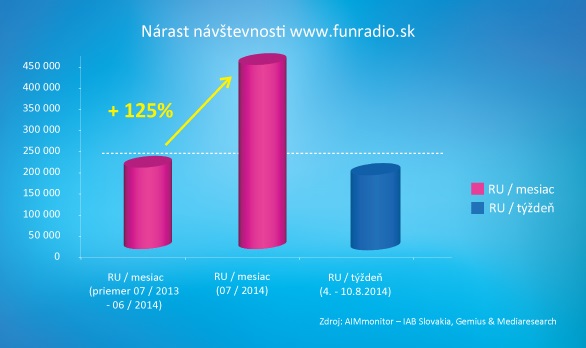 Funradio.sk upevňuje svoju pozíciu najnavštevovanejšieho rádiového webu. Počet reálnych užívateľov za mesiac júl 2014 dosiahol rekordných 433.678, čo predstavuje 125 %-ný nárast návštevnosti oproti priemernému mesačnému počtu RU za posledný rok. V súčasnom období (august 2014) web Fun rádia osloví približne toľko reálnych užívateľov za týždeň, koľko v predchádzajúcom období oslovoval za mesiac.