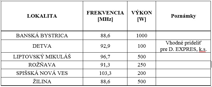 Úrad pre reguláciu elektronických komunikácií a poštových služieb odporúča z dôvodu možného vzájomného rušenia frekvencií prideliť frekvenciu 92,9 MHz Detva spoločnosti D. EXPRES, k.s. Konania bude Rada viesť osobitne na každú frekvenciu.