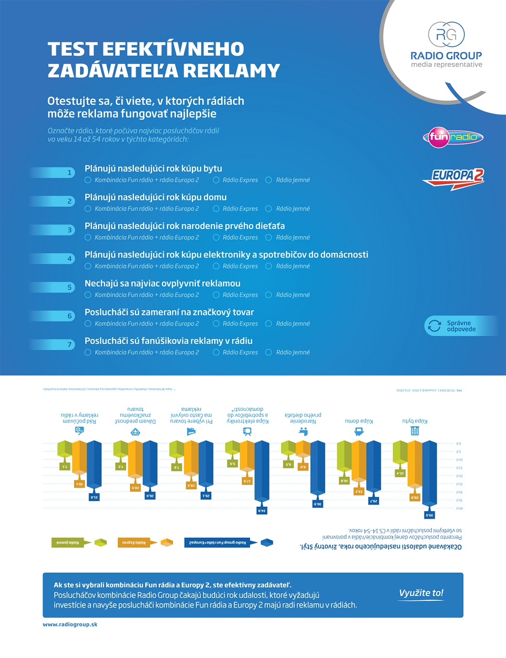 Výsledkom správne vyplneného testu je titul efektívneho zadávateľa reklamy, ktorý vie,  že poslucháčov kombinácie Radio Group čakajú budúci rok udalosti vyžadujúce investície a že poslucháči kombinácie Fun rádia a Europy 2 navyše majú radi reklamu v rádiách.