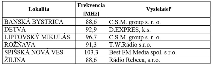 O dve frekvencie – 88,6 MHz Banská Bystrica a 96,7 MHz Liptovský Mikuláš rozšíri svoje pokrytie spoločnosť C.S.M group s.r.o., vysielateľ rádia Rocková republika. Po jednej frekvencii získali vysielatelia D.EXPRES, k.s. (Rádio EXPRES), T.W.Rádio s.r.o. (Rádio 7), Best FM Media spol. s r.o. (Rádio Best Fm) a Rádio Rebeca, s.r.o. (Rádio Rebeca).