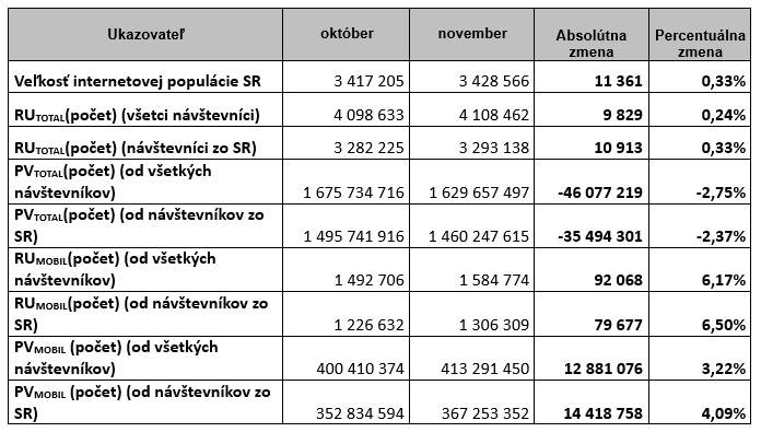 Počet reálnych užívateľov navštevujúcich webové stránky z mobilných zariadení sa oproti októbru zvýšil o 6 % a prvýkrát prekročil hodnotu 1,5 milióna. Nárast bol zaznamenaný aj v počte zobrazení stránok prostredníctvom mobilných zariadení (4 %).