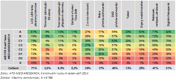 Televízor s plochou obrazovkou už v ČR vlastní väčšina domácností už i nižších socio-ekonomických skupín. Tie však stále zaostávajú vo vlastníctve napr. notebookov alebo digitálnych fotoaparátov. Najviac sa však vyššie sociálno-ekonomické skupiny od tých nižších odlišujú v penetrácii tabletov a smartfónov.
