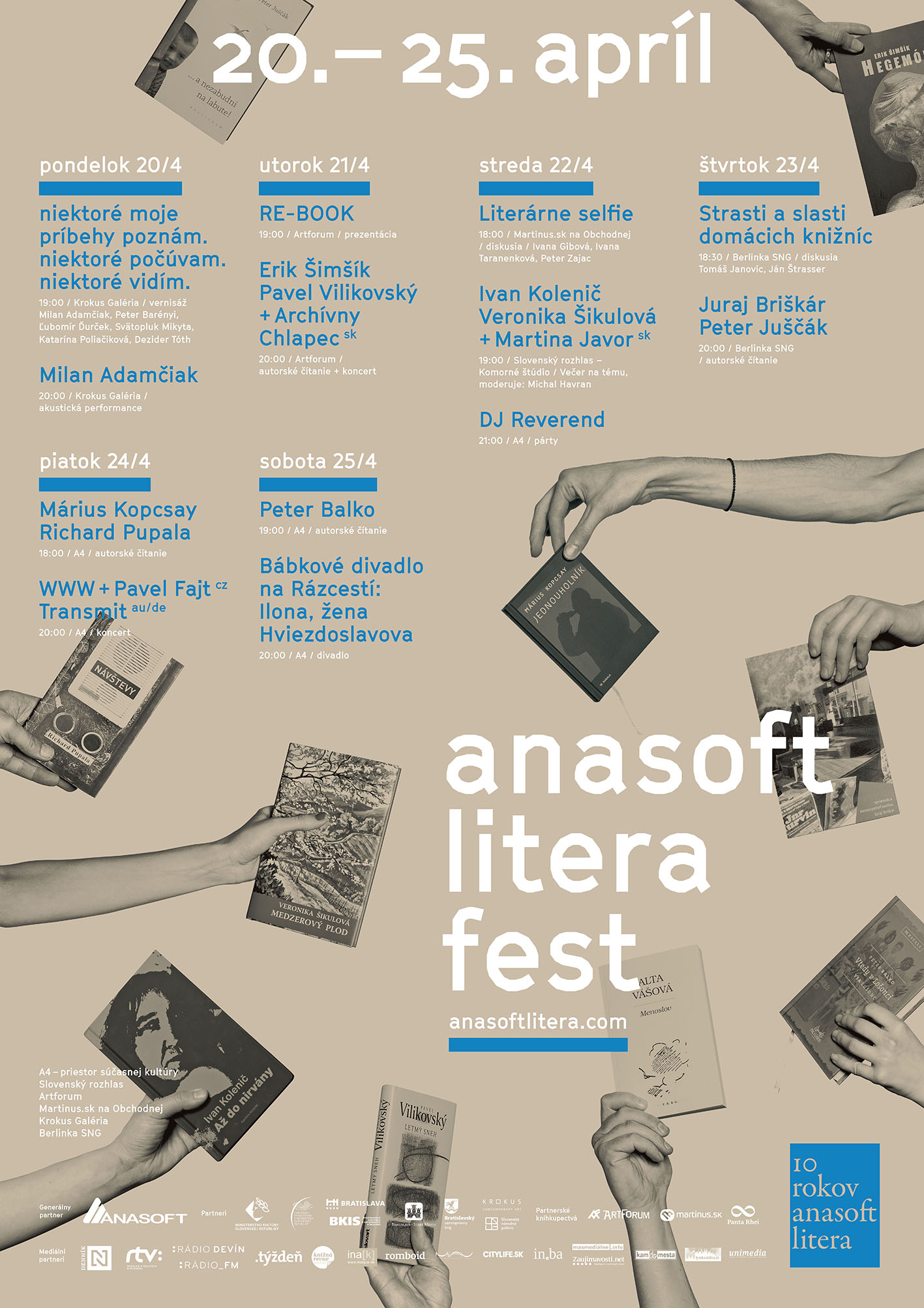 Už v pondelok 20. apríla sa začína Anasoft litera fest, ktorý je súčasťou prestížnej literárnej ceny Anasoft litera. Peter Balko, Juraj Briškár, Peter Juščák, Ivan Kolenič, Márius Kopcsay, Richard Pupala, Veronika Šikulová, Erik Šimšík a Pavel Vilikovský. To sú mená spisovateľov, ktorí 20. – 25. apríla 2015 predstavia svoje knihy ohodnotené odbornou porotou ako najlepšie prózy vydané v uplynulom roku. Na festivale bude chýbať finalistka Alta Vášová.
