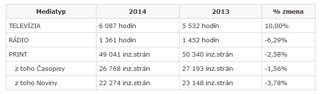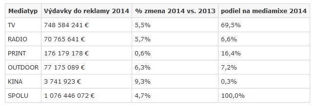 Hodnota reklamného času v rádiách v roku 2014 vzrástla, keď pri poklese odvysielaných reklamných minút (-6,3 percenta) zaznamenali rádiá nárast investícií do reklamy (5,7 percenta). Aj keď počet inzertných strán v printoch poklesol o 2,6 percenta, výdavky do reklamy v nich vzrástli o 0,6 percenta.