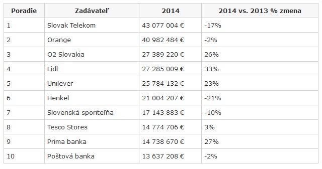 TOP 10 zadávateľov investovalo do reklamy 23 percent z celkového objemu reklamných výdavkov v roku 2014. Medziročne zvýšili TOP 10 zadávatelia svoje investície do reklamy o 1,5 percenta. 9 z 10 zadávateľov sa umiestnilo v tomto rebríčku aj v roku 2013.