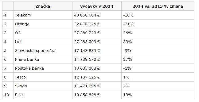 Hodnota reklamy značiek mobilných operátorov predstavuje takmer 10 percent celkových výdavkov do reklamy v roku 2014. 9 z 10 značiek bolo v TOP 10 aj rok predtým. Nováčikom v rebríčku je značka Billa, ktorá na 10.pozícii vystriedala značku Tatra banka.