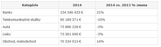 Prvých päť kategórií sa v TOP 5 nachádzalo aj v roku 2013, avšak kategórie Autá a Lieky si vymenili oproti roku 2013 pozície v rebríčku. Dvojmiestny nárast reklamných investícií zaznamenali kategórie Banky (21 percent) a Obchod (14 percent). Na podporu Telco služieb sa minulo o 10 percent menej. U Áut a Liekov bol pokles jednociferný (-3%, -5%).