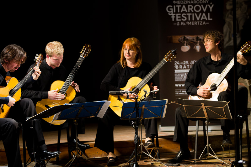 V rámci otváracieho koncertu vystúpilo aj Bratislavské gitarové kvarteto, ktoré sme už počuli aj záhrade dome Albrechtovcov. Zvolili opäť Rossiniho a od Lea Browera Kubánsku krajinku s rumbou. Apropo, majster Leo bol na otváracom koncerte prítomný a s nadšením sa venoval svojim fanúšikom, pozorne počúval a ocenil každú jednu interpretáciu potleskom.