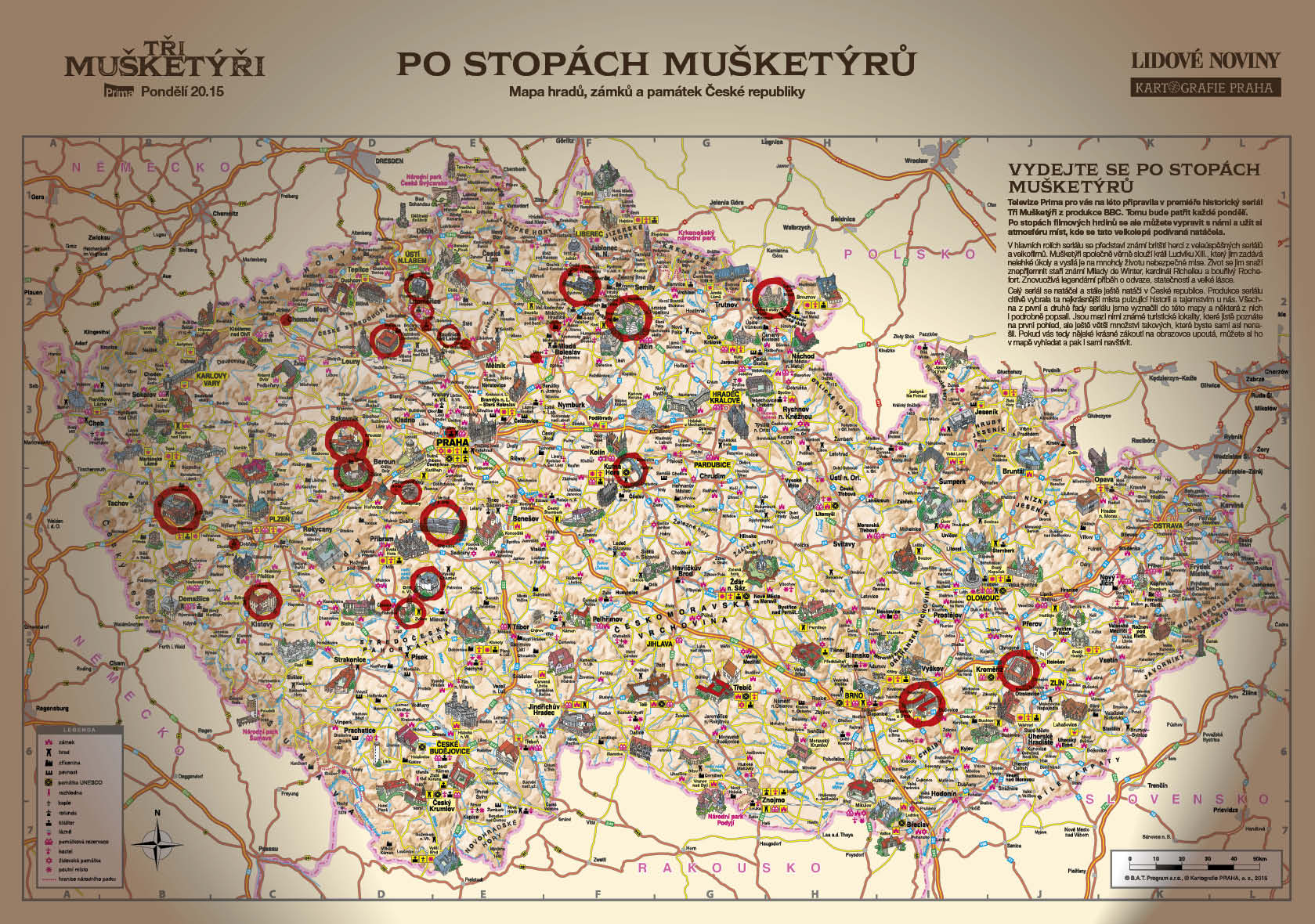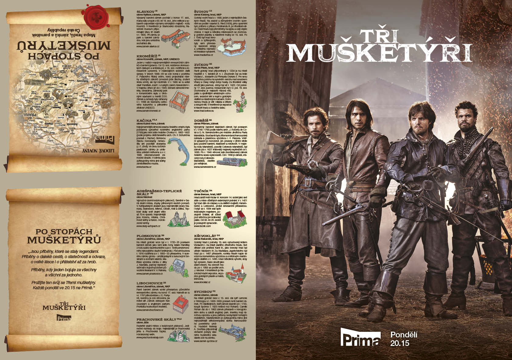 V rámci marketingovej a PR kampane k historickému seriálu Traja mušketieri z dielne BBC, ktorý uvedie televízia Prima v pondelok 29. júna, vydala v spolupráci s Lidovými novinami špeciálnu súťažnú mapu. Unikátna turistická mapa bola priložená k sobotňajšiemu vydaniu Lidových novín v sobotu 27. júna,ale k dispozícii je aj v elektronickej podobe na webe televízie. Vďaka nej sa tak diváci môžu vydať po stopách svojich hrdinov a stať sa súčasťou letného príbehu s Tromi mušketiermi.