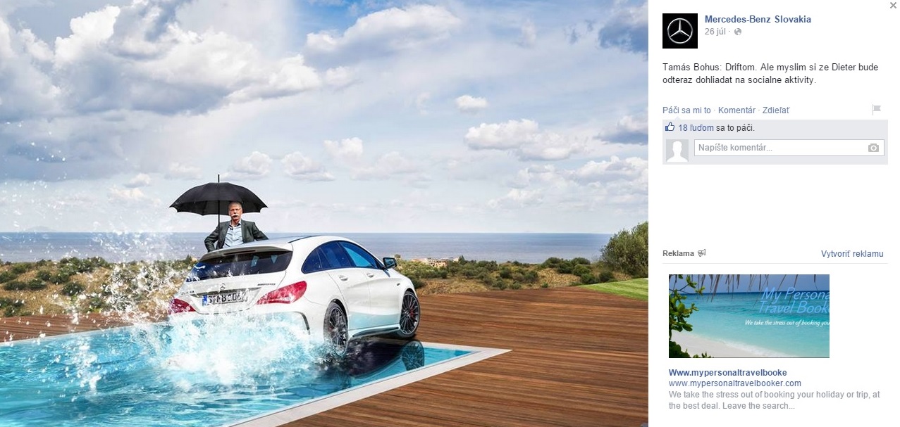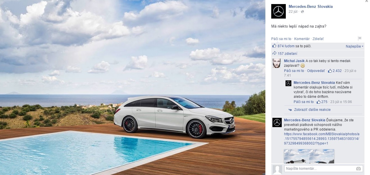 Začalo sa to správou, ktorú Mercedes-Benz Slovakia zverejnil na svojom fanúšikovskom profile na facebooku: „Má niekto lepší nápad na zajtra?“ s fotografiou pri bazéne odparkovanej CLA Shooting brake.