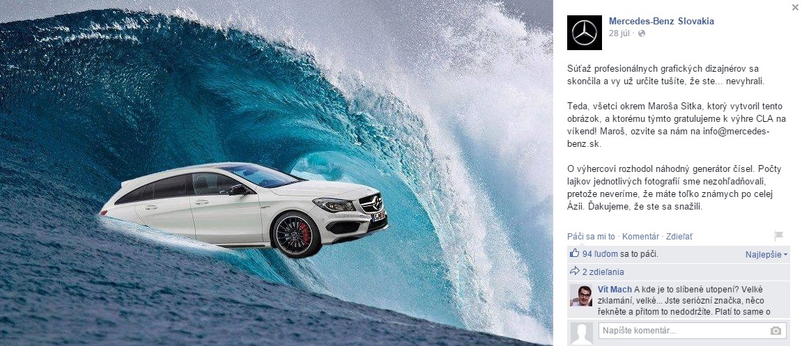 „Keby bolo po vašom, CLA Shooting Brake by si dlho nepojazdila. Obávame sa, že na niektoré poškodenia by nestačil ani bezplatný servis a poistenie, ktoré štandardne dostanete v cene auta. Toto sú vaše doterajšie výtvory. Lajkujte ten najlepší a jeden z nich získa CLA na víkend, „ uviedol Mercedes-Benz Slovakia.