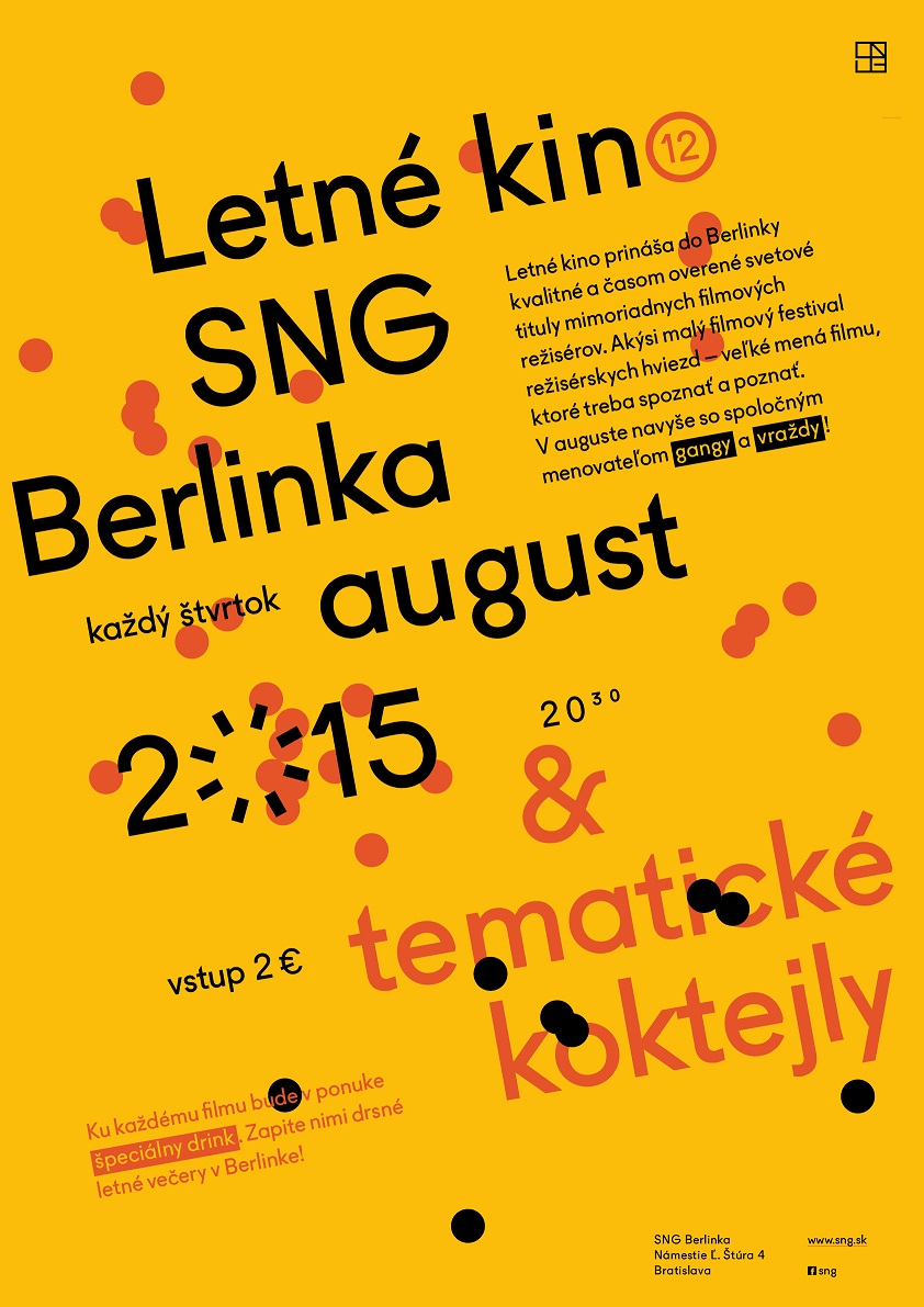 Letné kino Slovenskej národnej galérie je podujatie, ktoré prináša do bratislavskej kaviarne Berlinka kvalitné a časom overené svetové tituly mimoriadnych filmových režisérov.