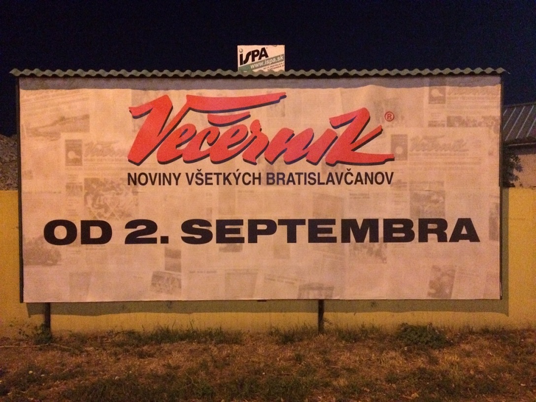Okrem billboardov bude mať Večerník kampaň v rádiu Jemné melódie. Chystá sa takzvaný guerilla marketing formou špecificky identifikovateľných kolportérov. V deň vydania nultého čísla 2. septembra plánujeme veľký event na Hlavnom námestí od 18-stej hodiny, na ktorý srdečne všetkých pozývame. Budeme tiež pripravovať pravidelnú reláciu v jednom z rádií. O konkrétnom stále rokujeme, ale bude to určite jedna z bratislavských frekvencií.