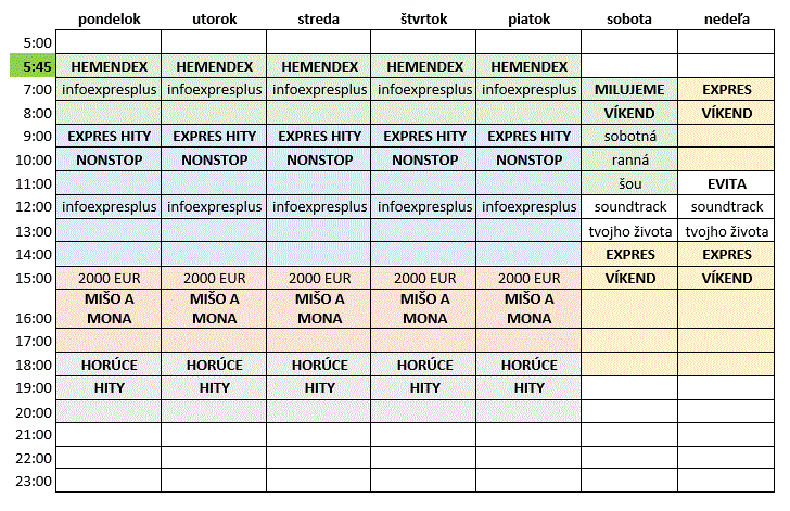 Novinkou v programovej štruktúre Expresu je relácia Horúce hity, ktorú bude líder na trhu vysielať každý pracovný deň po 18.00. Moderátorkou trojhodinovky s najnovšími hitmi bude Miša Vrábová, ktorá prichádza z interného prostredia redakcie spravodajstva.