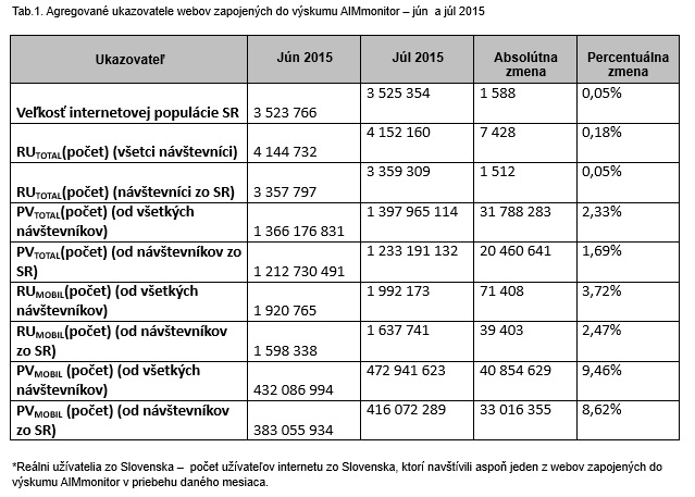V júli navštívilo webové stránky zapojené do AIMmonitoru viac ako 3,3 milióna slovenských a 800 tisíc zahraničných užívateľov. Slovenskí užívatelia vykonali na zapojených weboch viac ako 1,2 miliardy zobrazení stránok, najviac potom na webových stránkach spravodajstvo, na domovských stránkach portálov a zoznamovacích serveroch (všetky mali viac ako 200 miliónov zobrazení). Najviac času trávili užívatelia na webových stránkach v kategórii Zoznamovacie servery, chaty a blogy, a to 3 hodiny a 15 minút mesačne na užívateľa.