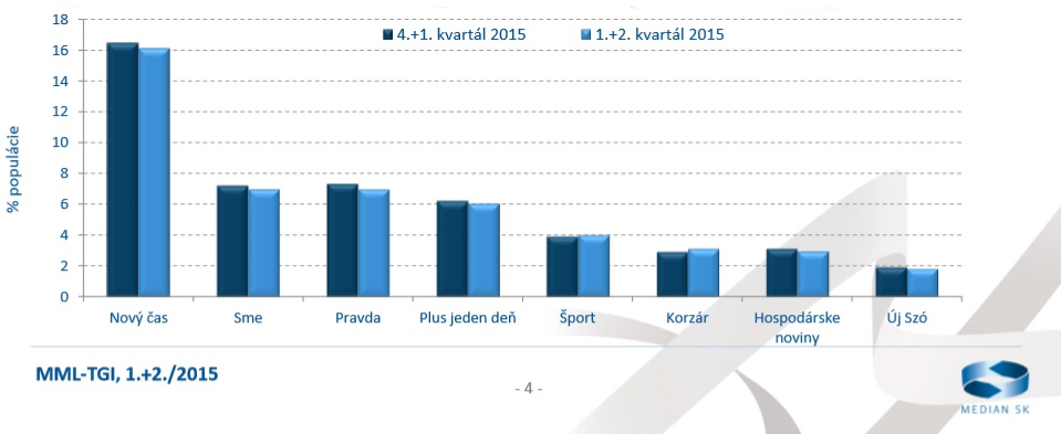 „Celková čítanosť celoštátnych denníkov v porovnaní so 4.+1. kvartálom 2015 klesla o 2% na 31% populácie. Tento údaj vychádza z premennej „čítal(a) posledné vydanie“. Pokiaľ vychádzame z premennej „čítal(a) posledných 14 dní“ ide o 67% populácie. o Celoštátne denníky v 1. a 2. kvartáli 2015 dosiahli nasledovné výsledky: Nový Čas si udržal prvú pozíciu so 16%. Čítanosť na úrovni 7% majú denník Sme a denník Pravda. Nasleduje denník Plus jeden deň so 6% a Šport so 4%. Korzár a Hospodárske noviny majú 3% čítanosť. Ďalej nasleduje Új Szó s 2% populácie vo veku 14 – 79 rokov,“ uvádza sa v správe z prieskumu výskumnej agentúry MEDIAN SK.
