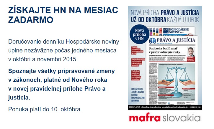 Vydavateľstvo Mafra Slovakia rozposiela od štvrtka 1.10.2015 e-mailing potenciálnym predplatiteľom. Ponúka im možnosť získať predplatné denníka Hospodárske noviny na mesiac zadarmo. Zároveň vydavateľstvo promuje novú prílohu denníka pod názvom Právo a justícia, ktorá bude súčasťou novín každý utorok už od 6. októbra.