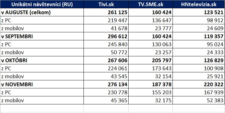 Tabulka-Tivi.sk, TV.SME.sk, HNtelevizia.sk-pocet unikatnych navstev RU, 2015-august az november-tabluka Masmedialne.info-zdroj-AIMmonitor