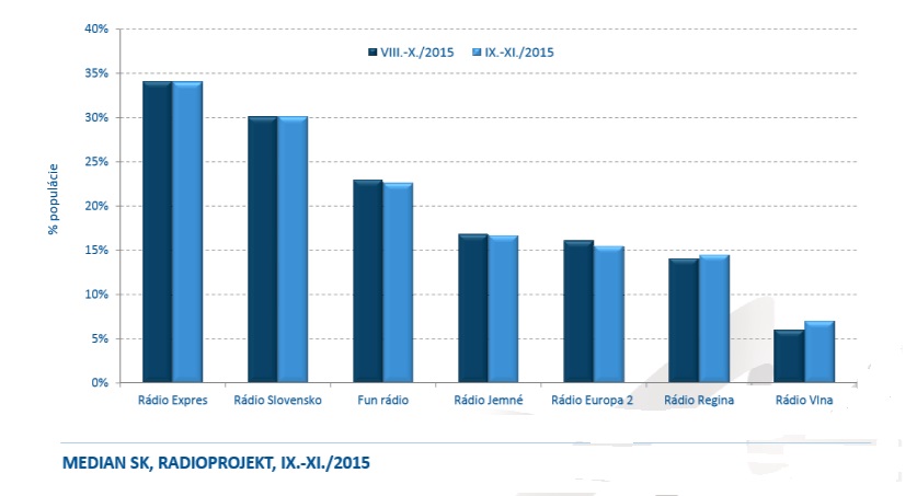 Výsledky pochádzajú z najnovšieho prieskumu Radioprojekt realizovaného spoločnosťou Median SK, zber dát sa uskutočnil v období od 17. augusta do 8. novembra 2015 na vzorke 3 645 respondentov vo veku medzi 14-79 rokov, občanmi Slovenskej republiky.