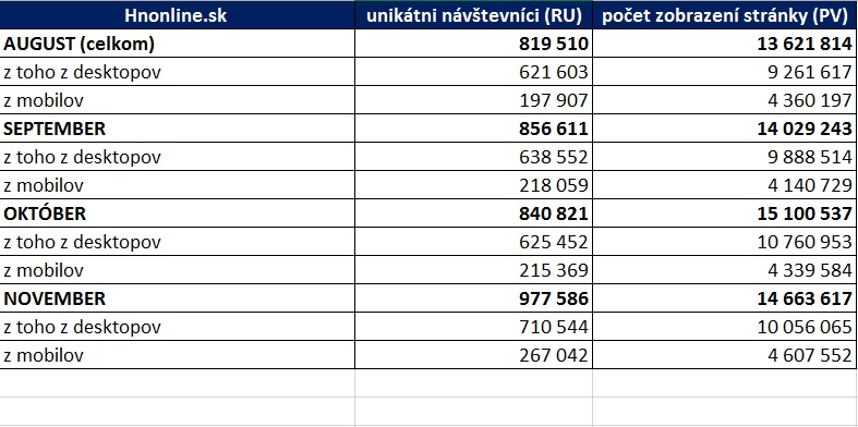 Rekord v počte unikátnych návštev (RU) prišiel len mesiac po prekročení hranice 15 miliónov zobrazených stránok (PV), ktoré web dosiahol v októbri 2015, podľa meraní AIMmonitor združenia IAB Slovakia. Za november web HNonline.sk dosiahol viac ako 14,6 milióna zobrazení stránky (PV).