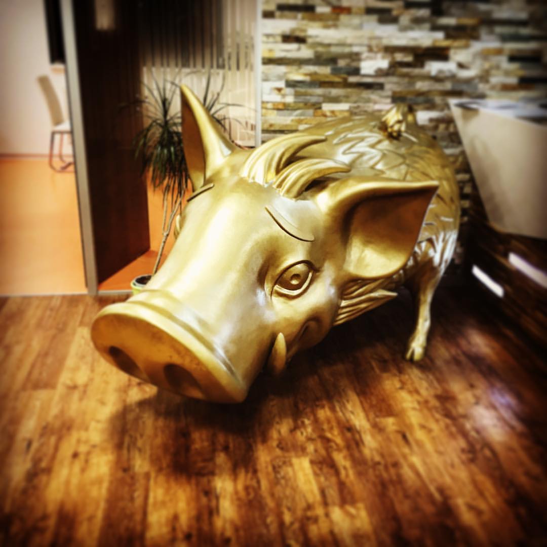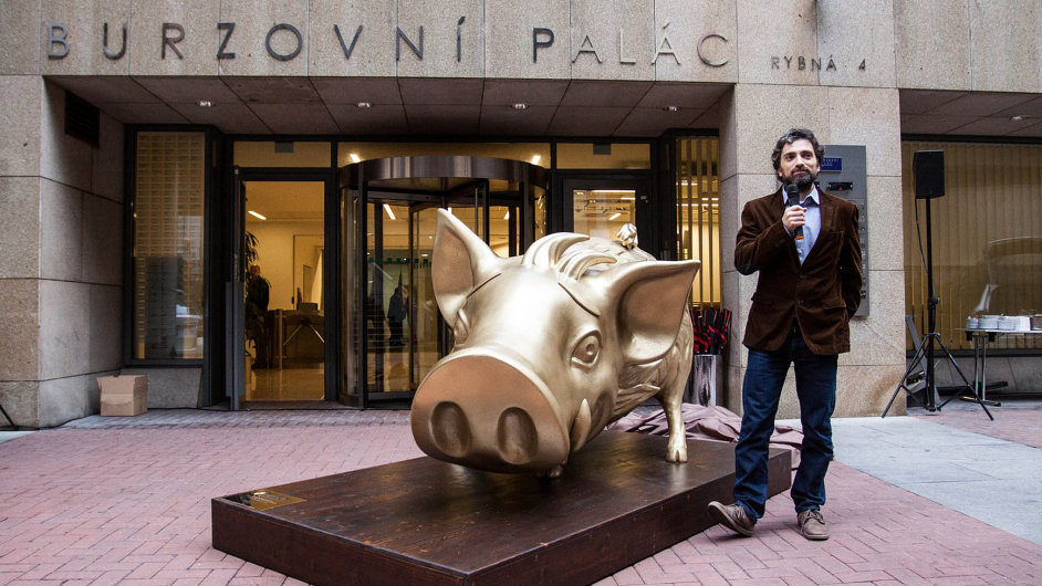 Aktualizované: Kampaň na kúpu akcií spoločnosti Kofola bola zameraná aj na investorov, nielen na širokú verejnosť, to sa docielilo vystavením „brata“ známeho býka z Wall street v podobe Zlatého prasiatka Kofoly, ktoré ho tak parodovalo.