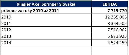 Ak však berieme do úvahy priemer EBITDA za posledných 5 rokov, čo predstavuje hodnotu viac ako 7,7 milióna eur, pri 7,5 násobku tejto hodnoty vychádza hodnota 100% akcií Ringier Axel Springer Slovakia zhruba na úrovni 58 miliónov eur, čiže suma, ktorú by spoločnosť Penta Investments, či iný prípadný záujemca musel zaplatiť za zhruba polovičný podiel Axel Springer v spoločnosti RAS sa pohybuje pravdepodobne v rozmedzí 25 až 30 miliónov eur.