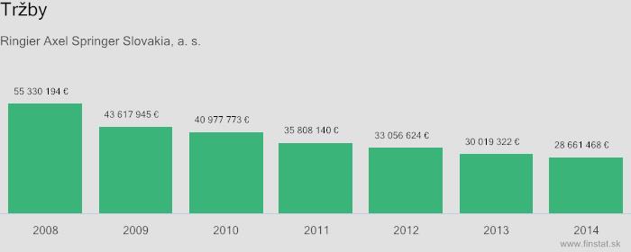 Pozrite si vývoj tržieb vydavateľstva Ringier Axel Springer Slovakia v rokoch 2008 až 2014, podľa zverejnenej účtovnej závierky (graf zdroj: finstat.sk):