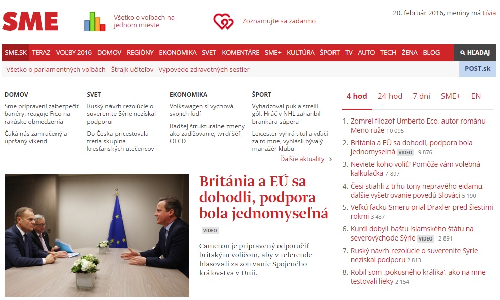 - medzi najčítanejšie a najnovšie články vpravo v menu redakcia zaradí aj sekcie s výberom článkov zo SME+ a články v anglickom jazyku z novín The Slovak Spectator
