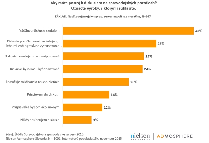 Diskusie pod článkami sledujú štyria z desiatich čitateľov a len 14% z nich sa do nich aj aktívne zapája. Medzi diskutujúcimi prevažuje skupina mužov, nad ženami, vyplynulo zo štúdie s názvom Spravodajstvo a spravodajské servery 2015, ktorú realizovala výskumná spoločnosť Nielsen Admosphere Slovakia na vzorke tisíc respondentov vo veku nad 15 rokov internetovej populácie Slovenského národného panela.