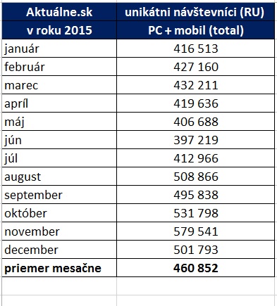 V mesiaci január 2016 dosiahol portál Aktualne.sk čítanosť, podľa výskumu AIMmonitor viac ako 564 tisíc unikátnych návštevníkov za mesiac. Pre porovnanie jednotka na trhu web SME.sk dosiahol v rovnakom období čítanosť viac ako 2 milióny 290 tisíc RU.