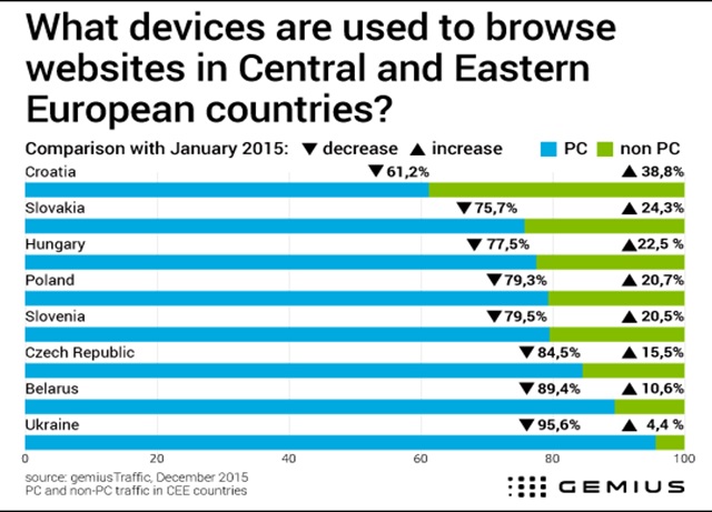 Najvyšší podiel tzv. non-PC zobrazení bol zaznamenaný v Chorvátsku (takmer 40 %), za ním nasleduje Slovensko (24,3 %)a Maďarsko (22,5 %). Naopak najnižší podiel mobilných zobrazení bol zaznamenaný na Ukrajine (4,4 %).