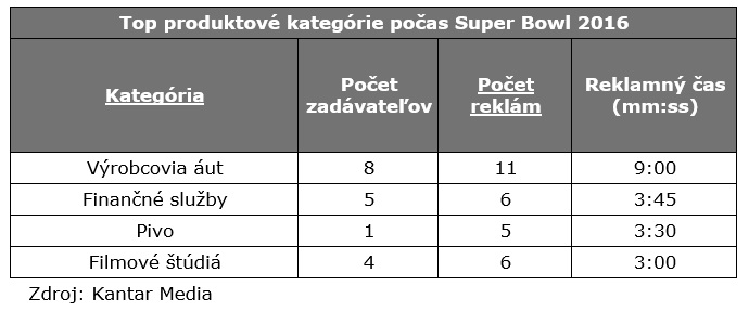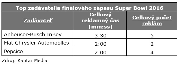 Tabuľka – Top zadávatelia finálového zápasu Super Bowl 2016