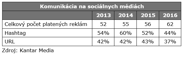 “Z výsledkov analýzy agentúry Kantar Media vyplýva, že hashtag opäť viedol nad URL. 44% platených reklám (27 zo 62) bolo na sociálnych sieťach spomenutých cez hashtag v porovnaní s len 37% cez URL (23 zo 62),“ povedala Vladimíra Bunčáková, PR manažérka z výskumnej agentúry TNS Slovakia.