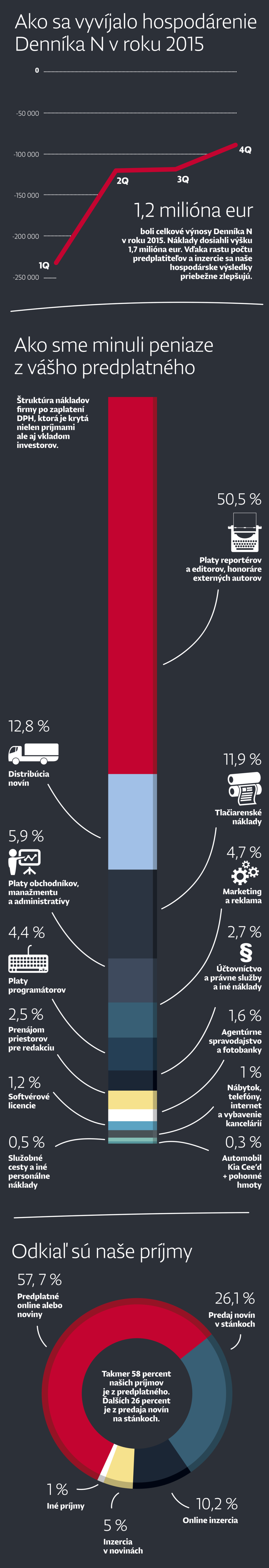 Celkové výnosy v roku 2015 dosiahli 1,2 milióna eur pri nákladoch 1,7 milióna eur. V súčasnosti je teda vydavateľstvo denníka N v strate -500 tisíc eur, ale „vďaka rastu počtu predplatiteľov a inzercie sa naše hospodárske výsledky priebežne zlepšujú,“ ako uvádza vydavateľstvo.