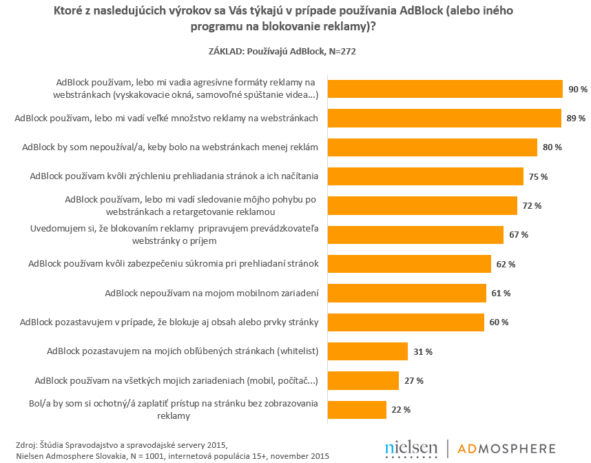 Väčšina z týchto užívateľov pritom uvádza, že programy na blokovanie reklamy by nepoužívala, ak by jej bolo menej. Ukázala to štúdia s názvom Spravodajstvo a spravodajské servery 2015, ktorú realizovala výskumná agentúra Nielsen Admosphere na reprezentatívnej vzorke slovenskej internetovej populácie staršej ako 15 rokov.