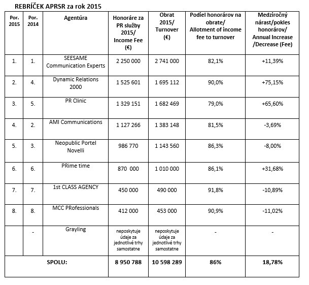 Asociácia public relations Slovenskej republiky (APRSR) zverejnila rebríček členských agentúr združených v asociácii. Agentúra Seesame Communication Experts si udržala prvé miesto, druhé miesto obsadila agentúra Dynamic Relations 2000 a na treťom mieste sa umiestnila agentúra PR Clinic. Objem čistých prijatých honorárov za PR služby členských agentúr APRSR dosiahol takmer 9 miliónov eur a celkový obrat predstavuje 10,5 milióna eur. Obrat medziročne vzrástol o viac ako 18 percent.
