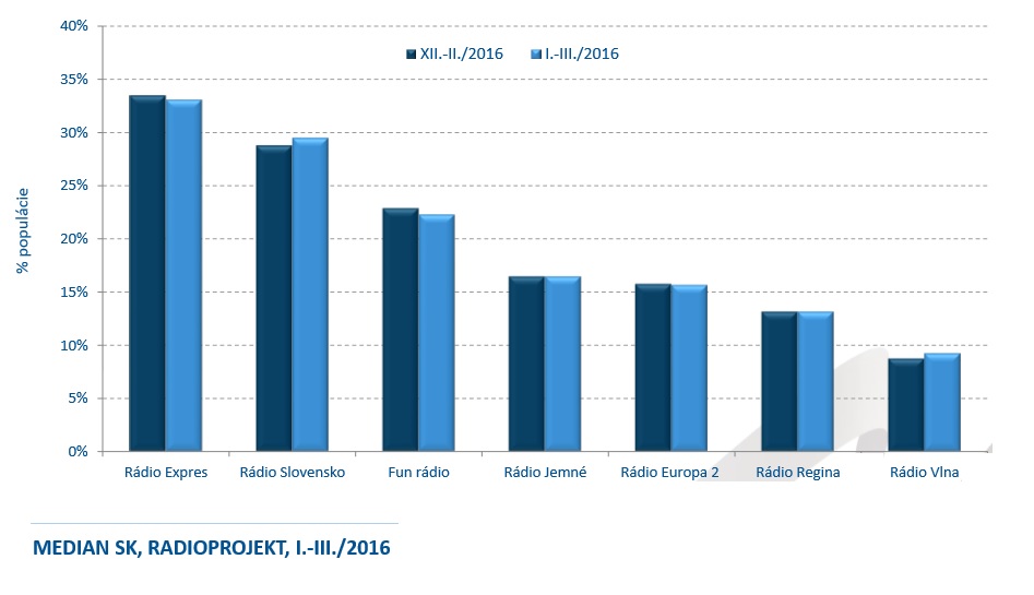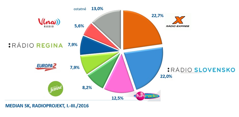 „V meranom období dosiahli rozhlasové stanice v parametri podiel na trhu (share) nasledovné výsledky: Rádio Expres s 22,7% podielom na trhu, Rádio Slovensko má 22,0% a s 12,5% podielom nasleduje Fun rádio. Ďalej Rádio Jemné s 8,2% a Rádio Europa 2 so 7,9% podielom na trhu. Rovnako 7,9% podiel má aj Rádio Regina. Nasleduje Rádio Vlna s 5,6%. Ostatné rozhlasové stanice držia podiel 13,0% z trhu,“ uviedla agentúra MEDIAN.