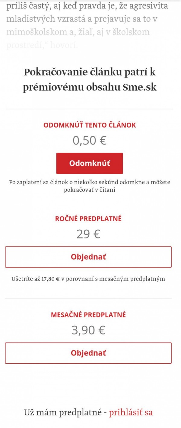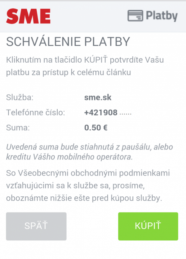 Po mesačnej či ročnej platbe za prémiový obsah spravodajského webu SME.sk ponúka vydavateľstvo Petit Press čitateľom i možnosť platby za jeden článok. Cena pri takomto spôsobe platby je 0,50 eur. Zároveň vydavateľstvo spustilo i zjednodušenú formu platby za prémiový obsah pre používateľov siete Orange s mobilným pripojením.