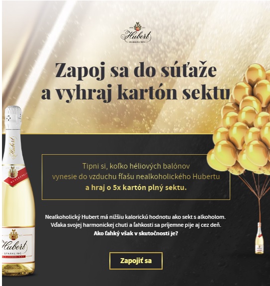 Spotrebitelia tak mohli hádať prostredníctvom aplikácie na Facebook stránke S Hubertom mi život chutí, koľko balónov naplnených héliom je treba, aby fľaša sektu Hubert vzlietla. Odmenou pre tipujúcich boli kartóny nealko sektu.
