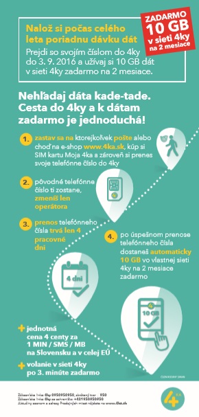 Štvrtý mobilný operátor 4KA chce motivovať zákazníkov k prenosu telefónneho čísla od konkurencie. Každý nový zákazník získa jednorazovo 10 GB dát v sieti 4KA na dva mesiace úplne zadarmo, akcia potrvá do 3. septembra. Mobilný operátor ku koncu júna dosiahol hranicu 200-tisíc zákazníkov a plné pokrytie 70-tich miest signálom 4G siete po celom Slovensku. Kampaň je z dielne reklamnej agentúry Roland Torsten.