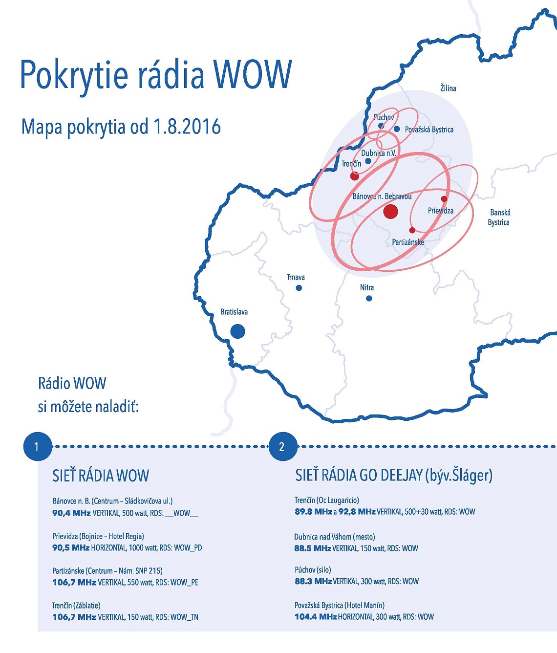 Rádio WOW sa po zlúčení s rádiom GO DeeJay (Šláger) dá naladiť aj v Dubnici nad Váhom, Púchove, Ilave, Novej Dubnici a Považskej Bystrici, ale i v Trenčíne (až na troch frekvenciách) a v Bánovciach nad Bebravou (až na dvoch frekvenciách).