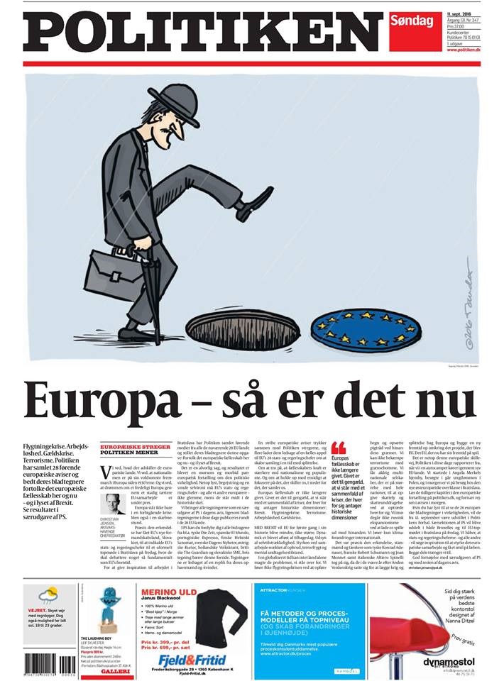 Po denníku SME, ktorý karikatúru zverejnil 26. júna ako „Brexit – alebo ministerstvo švihnutej chôdze“, ju na svojej titulke 11. septembra zverejnil aj dánsky denník Politiken, keď písali o téme súčasného stavu Európy a zverejnil aj kresby od autorov zo všetkých členských štátov únie. História denníka Politiken siaha až do roku 1884 > pozri.