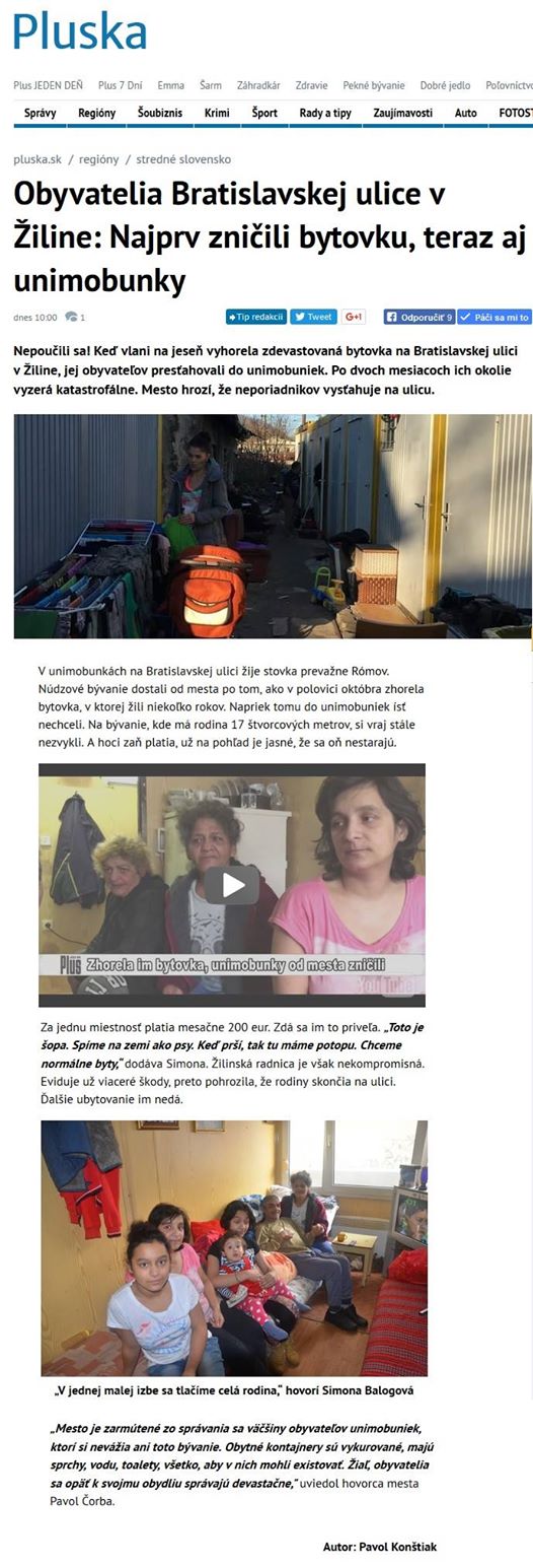Portál Pluska.sk zverejnil 21. februára reportáž pod názvom „Obyvatelia Bratislavskej ulice v Žiline: Najprv zničili bytovku, teraz aj unimobunky“. Reportáž redaktora Pavla Konštiaka opisovala život rómov v núdzovom ubytovaní v unimobunkách, ktoré im poskytlo mesto, po tom čo rómom zhorela bytovka. K reportáži sa kriticky postavila reportérka RTVS Zuzana Hanzelová, ktorá na problém upozornila na sociálnej sieti a rozhodla sa priniesť vlastnú reportáž a objektívne ukázať v akých podmienkach rómovia žijú. Pluska.sk neskôr článok doplnila.